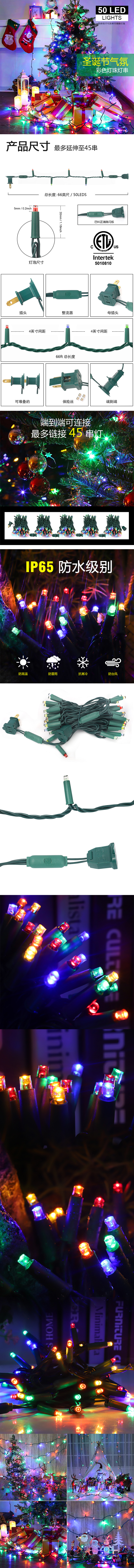 户外5m 50珠绿色电线多色5mm LED圣诞灯串,用于圣诞装饰